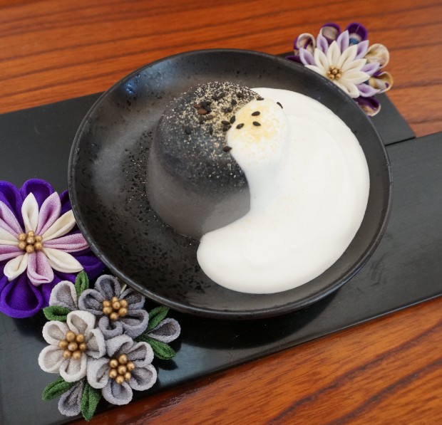 ⑥④が固まったら生クリームをかけ、きなこと黒ゴマをトッピングして出来上がり。