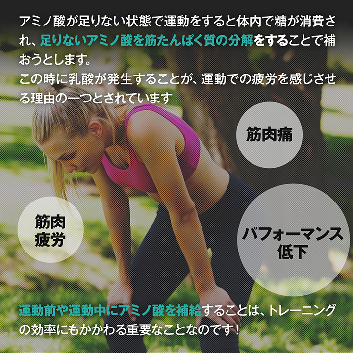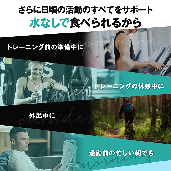 運動前に摂取すると運動時のパフォーマンスをサポートし、より効率的な体づくりをサポートします。