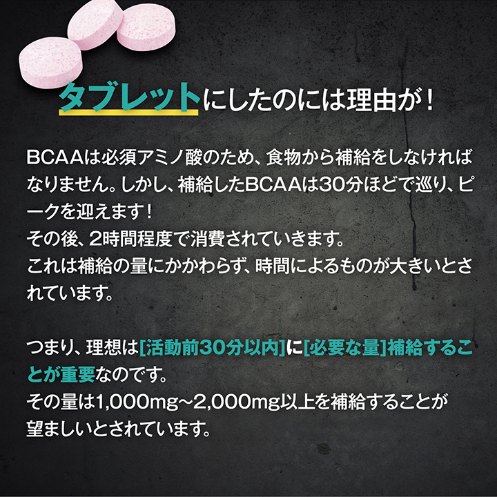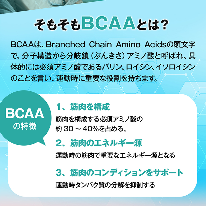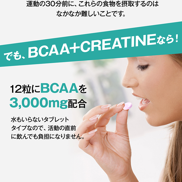 運動に必要なエネルギー源として役立つBCAA(バリン、ロイシン、イソロイシン)を12粒で3000mg配合!