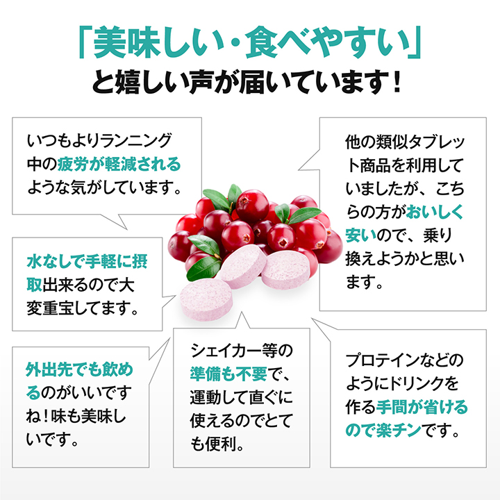 還元麦芽糖水飴、デキストリン、クランベリー粉末、クレアチンモノハイドレート/L-ロイシン、L-バリン、L-イソロイシン、結晶セルロース、クエン酸、香料、ヒドロキシプロピルセルロース、ステアリン酸Ca、微粒二酸化ケイ素、甘味料(ステビア、アスパルテーム・L-フェニルアラニン化合物)