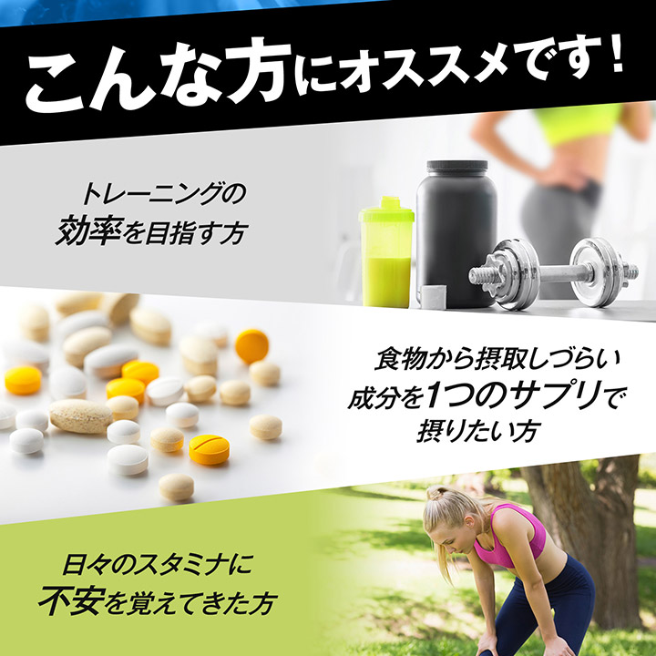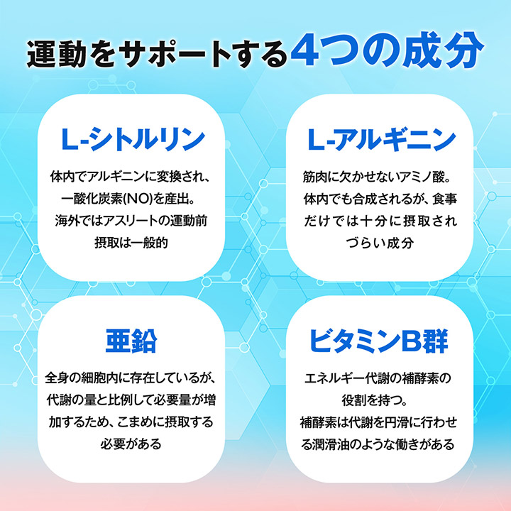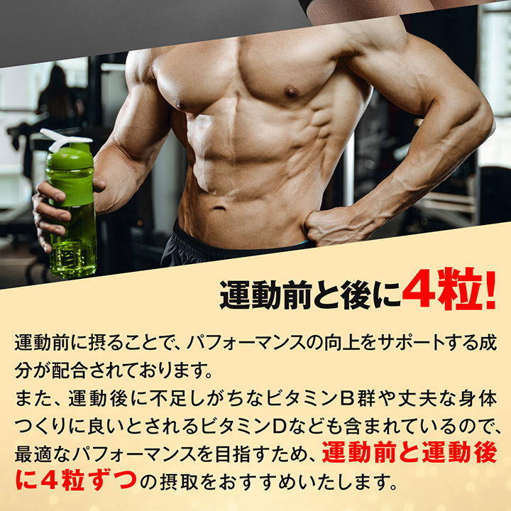 運動に関わりの深い2種類のアミノ酸に、近年、運動サポートでも注目されているビタミンDと、トレーニングに欠かせない亜鉛、ビタミンB群をプラス。しなやかな体づくりと疲れた体をサポート。