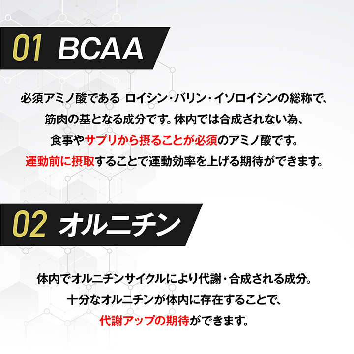 BCAAとオルニチンに加え、相乗効果の期待できる成分をバランス良く配合。