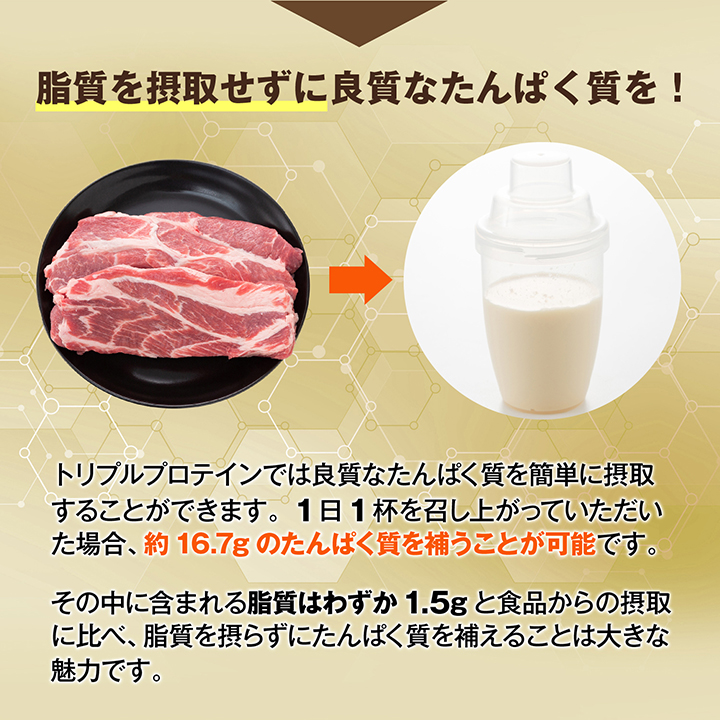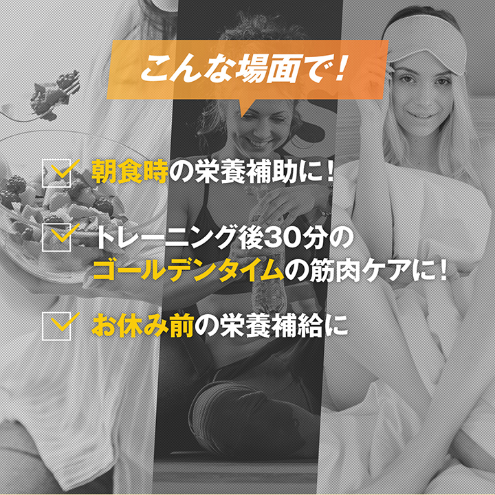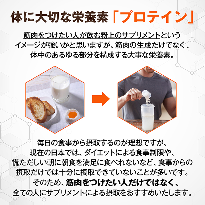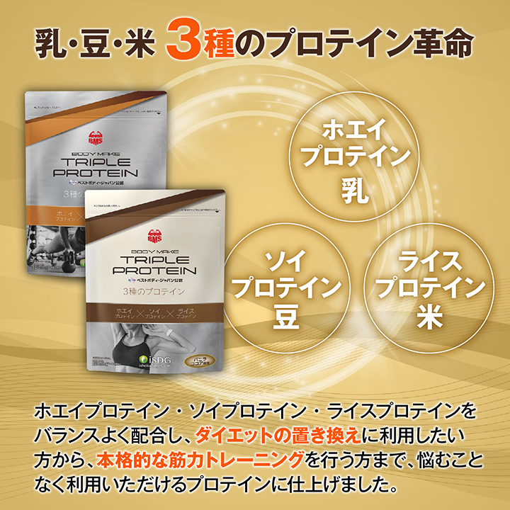 3種のプロテイン(ホエイ・ライス・ソイ)を配合することで、吸収スピードと持続性の両面を兼ね備えた粉末タイプのプロテイン。