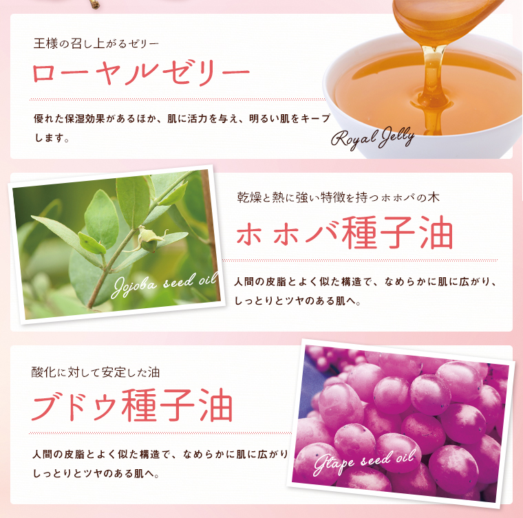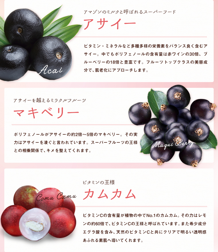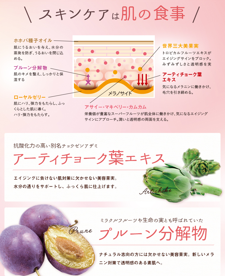水、グリセリン、BG、シクロペンタシロキサン、トリエチルヘキサノイン、スクワラン、ペンチレングリコール、アサイヤシ果実エキス、アリストテリアチレンシス果実エキス、ミルシアリアデュビア果実エキス、プルーン分解物、アーチチョーク葉エキス、加水分解マンゴー液汁エキス、加水分解マンゴスチン果実エキス、加水分解チェリモヤ果実エキス、ローヤルゼリーエキス、ブドウ種子油、ホホバ種子油、ポリクオタニウム-51、水添レシチン、ポリアクリル酸Na、ミリスチン酸ポリグリセリル-10、トリデセス-6、パルミチン酸エチルヘキシル、ベタイン、カルボマー、ジイソステアリン酸ポリグリセリル-2、フェニルトリメチコン、クエン酸、(アクリレーツ/アクリル酸アルキル(C10-30))クロスポリマー、PEG/PPG-18/18ジメチコン、水酸化K、ジメチコン、フェノキシエタノール