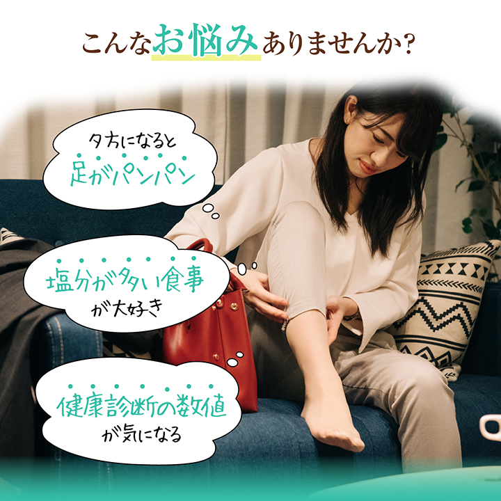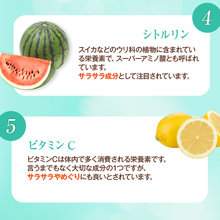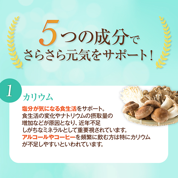 ミネラルバランスの調整成分であるカリウム、褐藻抽出物を配合。さらに、ヘスペリジン、ビタミンC、シトルリンを配合し、相乗効果でサラサラ元気をサポートします。