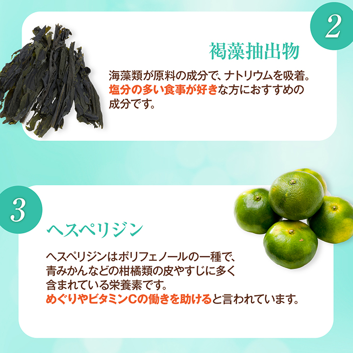 褐藻抽出物(国内製造)、L-シトルリン/塩化カリウム、結晶セルロース、ビタミンC、酵素処理ヘスペリジン、ステアリン酸カルシウム、微粒二酸化ケイ素