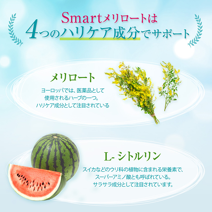 メリロート、L-シトルリン、アボカド、カリウムの4つの成分でスッキリ・キレイをサポートします。