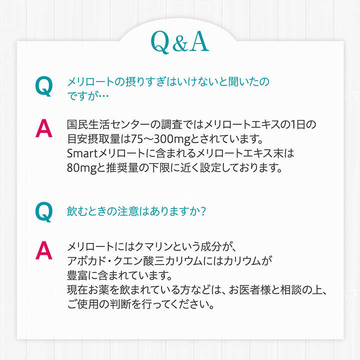 メリロートエキス末、L-シトルリン、乳糖、還元麦芽糖水飴、アボカド粉末(アボカドピューレ、デキストリン)/結晶セルロース、クエン酸三カリウム、ステアリン酸カルシウム、微粒二酸化ケイ素、pH調整剤(乳由来)、乳化剤、酸化防止剤(V.C)